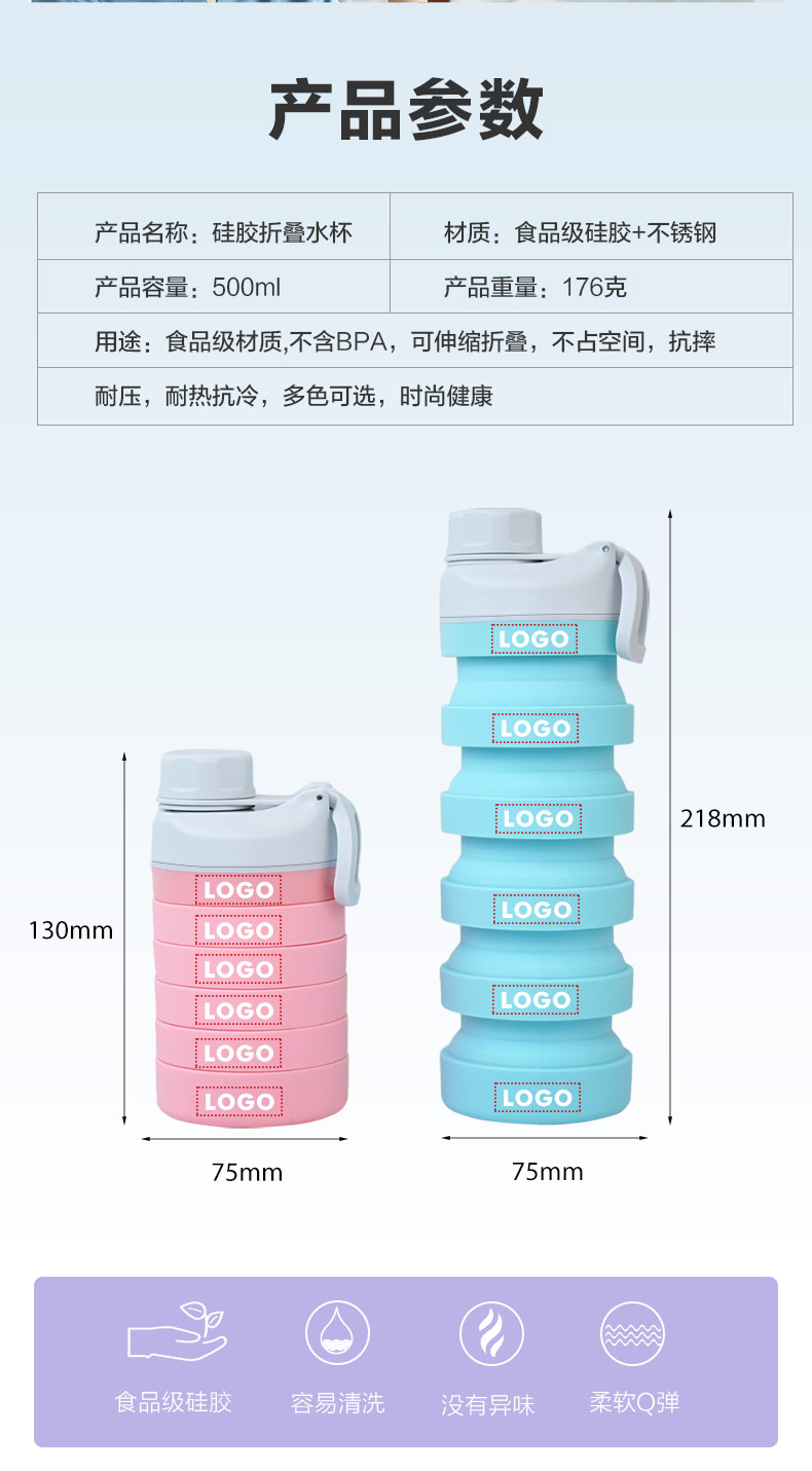 用途:食品級(jí)材質(zhì),不含BPA,可伸縮折疊,不占空間,抗摔 耐壓,耐熱抗冷,多色可選,時(shí)尚健康