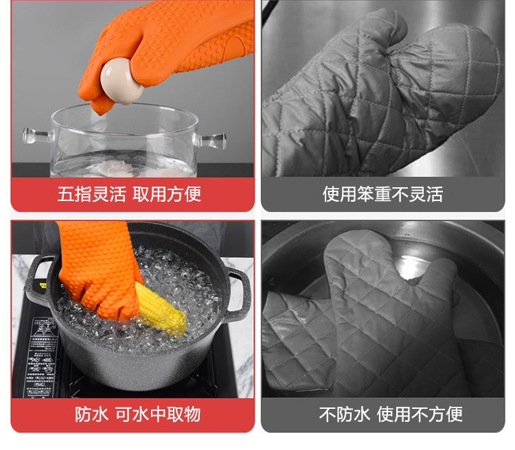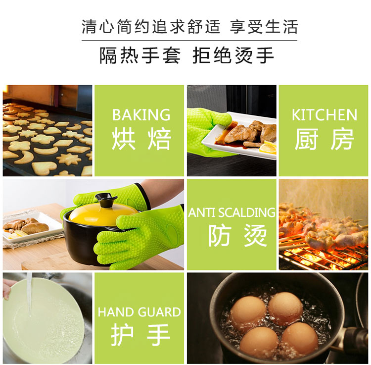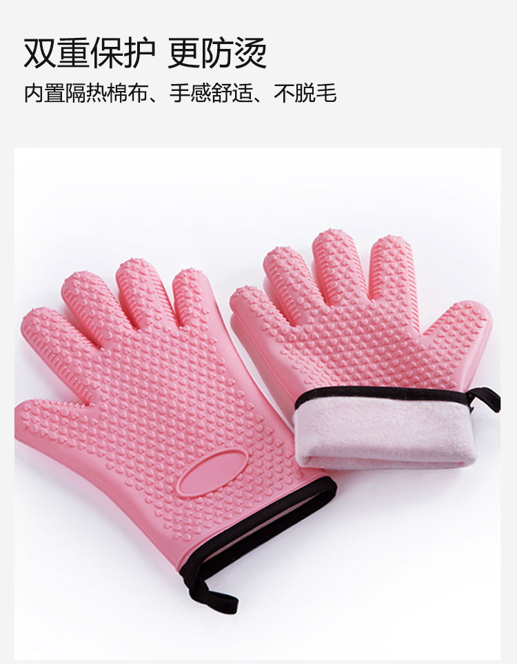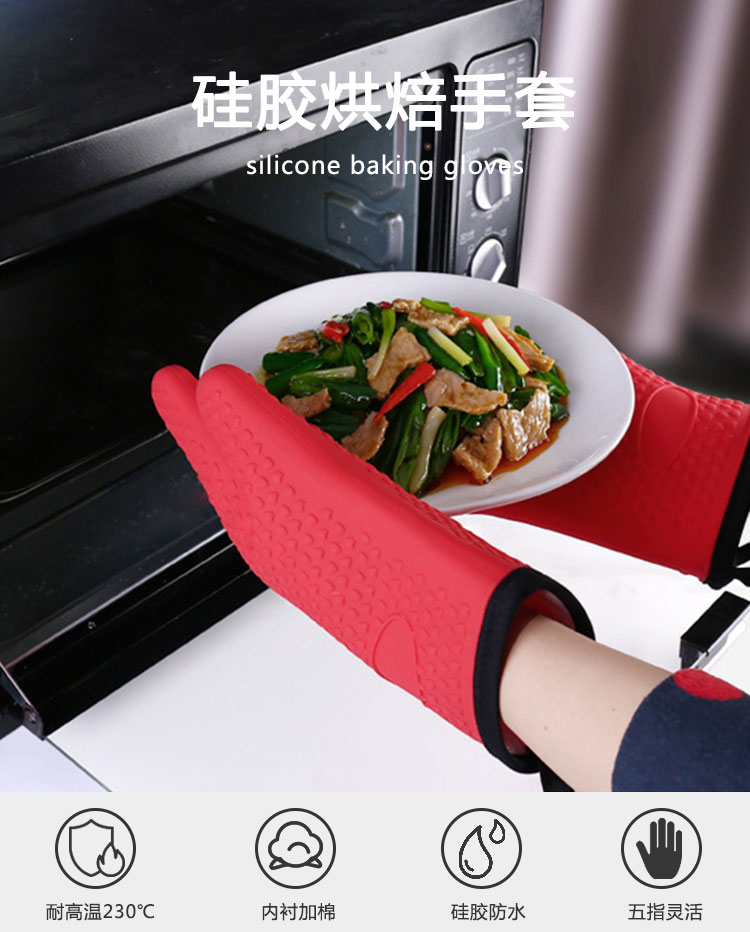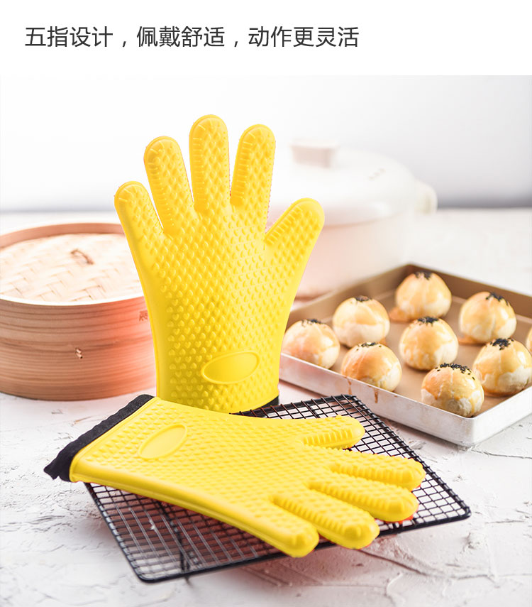 硅膠烘焙手套質地柔軟,分指設計,防滑防臟,內置隔熱棉,有效保護雙手。